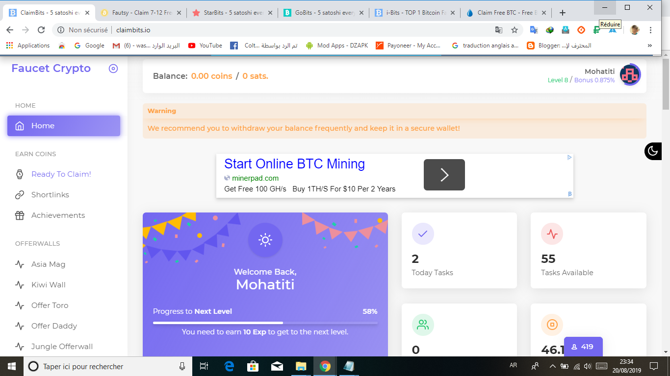 السلام عليكم اخواني اخواتي متابعي قناه الارباح اليوم إنشاء الله سأتطرق الى شرح موقعين جديدين لربح عمله البيتكوين مجانا اخواني وكما تعلمون ان عمله البيتكوين في تطوروتزايد مستمر هي عملة المستقبل وكثير من المواقع تقدم هاته العمله و تستطيع تحويلها الى دولارات